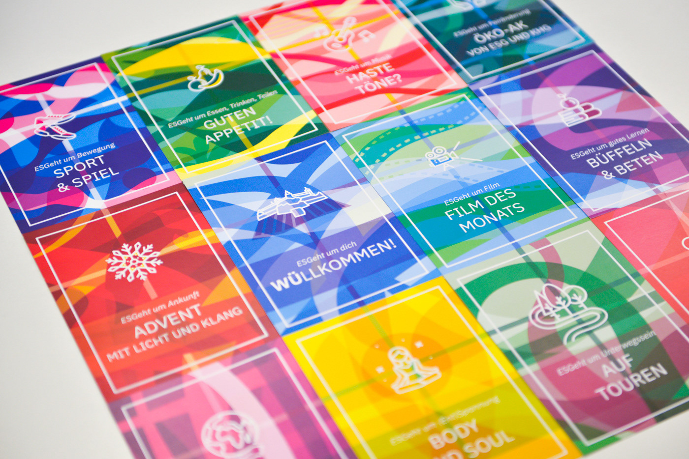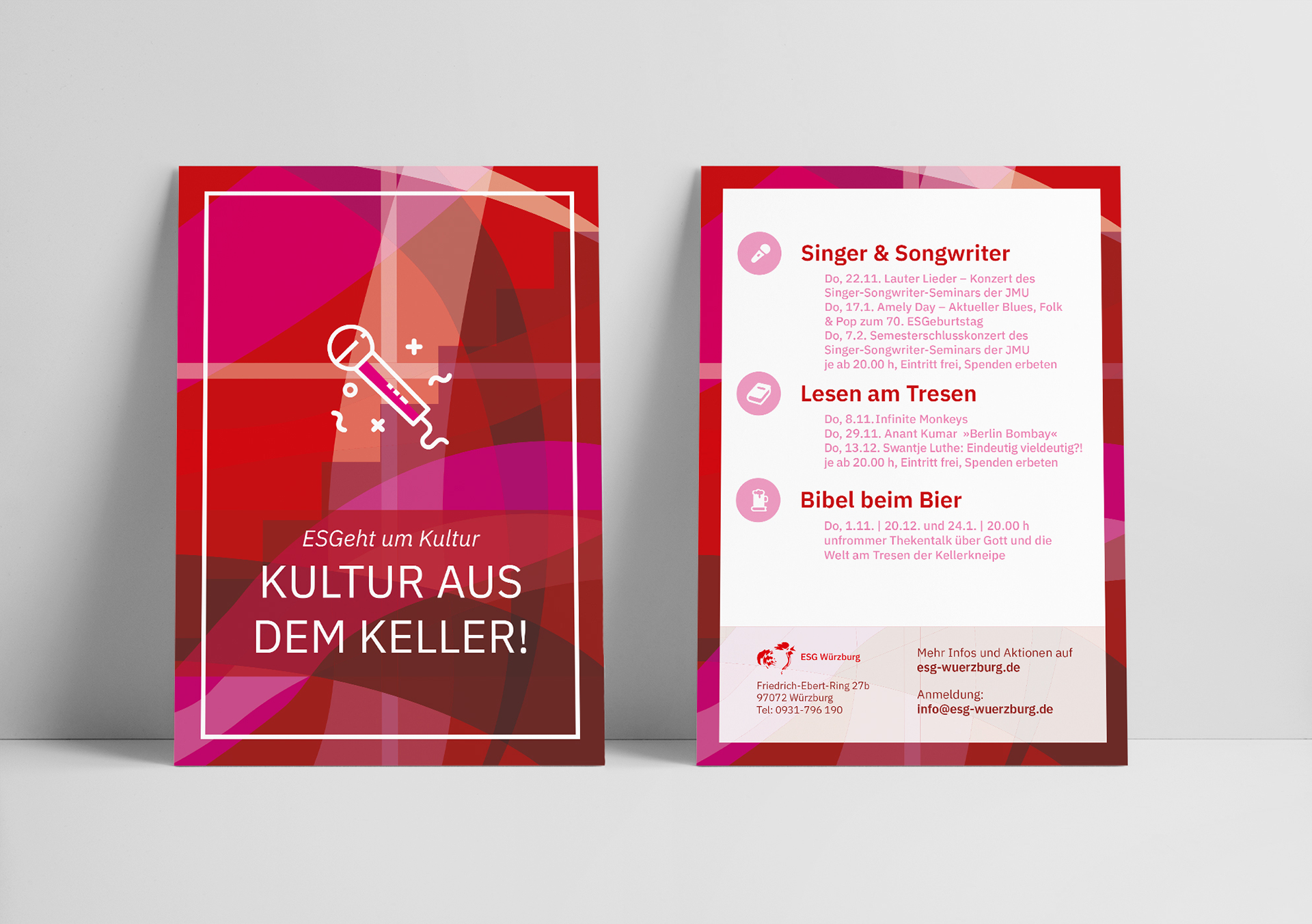 Eine neue Plakat- und Flyerreihe wurde für die evengelische Studierendengemeinde Würzburg angelegt. Zwölf Motive wurden für verschiedenste spirituelle und aktionsbasierte Veranstaltungen entworfen und umgesetzt.
